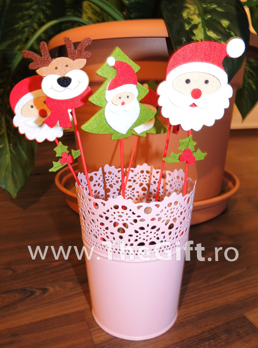 Ornament minunat din lemn si pasla, cu brad, inimioara si caciula de Mos Craciun, care se poate infige in orice suprafata moale, inclusiv zapada sau tort.