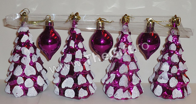 Setul de 7 accesorii pentru bradul de Craciun contine 4 globuri mari, in forma de brad si 3 globuri mici, in forma de lacrima.